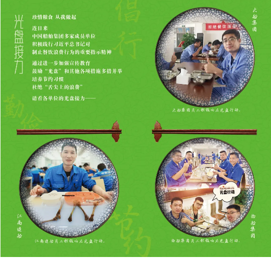 為認(rèn)真貫徹落實(shí)習(xí)近平總書記關(guān)于制止餐飲浪費(fèi)行為的重要指示精神,大力弘揚(yáng)中華民族勤儉節(jié)約、珍惜糧食的文明用餐習(xí)慣,中國船舶集團(tuán)積極開展“制止餐飲浪費(fèi) 踐行光盤行動(dòng)”專項(xiàng)宣傳引導(dǎo)活動(dòng)。