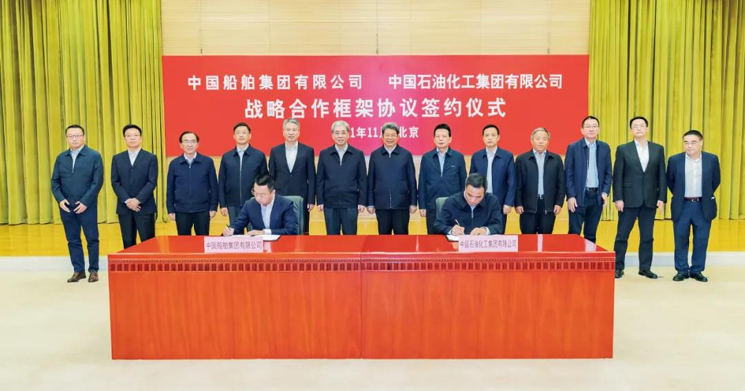 11月29日,中國船舶集團有限公司與中國石油化工集團有限公司簽署戰略合作框架協議。中國船舶集團黨組書記、董事長雷凡培,黨組成員、副總經理盛紀綱,中國石油化工集團黨組書記、董事長馬永生,黨組成員、副總經理凌逸群出席簽約儀式。盛紀綱和凌逸群分別代表雙方在協議上簽字。