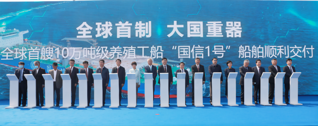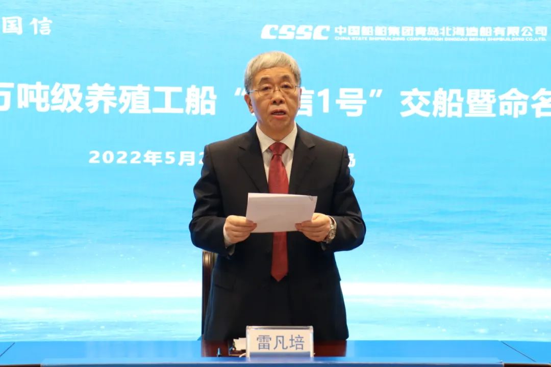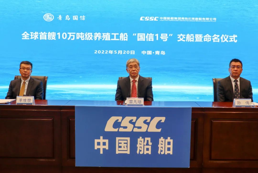 5月20日,中國船舶集團(tuán)旗下青島北海造船有限公司為青島國信發(fā)展(集團(tuán))有限責(zé)任公司建造的全球首艘10萬噸級智慧漁業(yè)大型養(yǎng)殖工船“國信1號”交船命名儀式在青島舉行。中國船舶集團(tuán)黨組書記、董事長雷凡培,黨組成員、副總經(jīng)理孫偉通過視頻出席儀式,山東省人民政府黨組成員、副省長凌文,青島市委副書記、市長趙豪志,中國海洋大學(xué)黨委副書記、校長于志剛,中國工程院院士麥康森等領(lǐng)導(dǎo)和嘉賓出席儀式。青島市副市長趙燕為新船命名。
