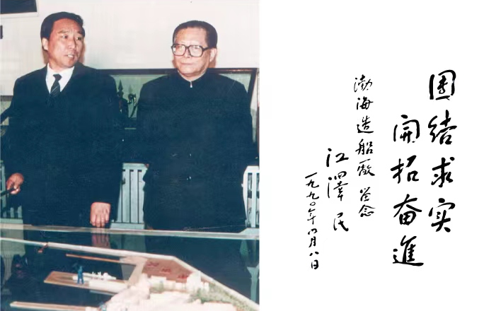 1990 年4月8日,江澤民同志視察渤海造船廠并題詞“團結(jié)求實,開拓奮進”。