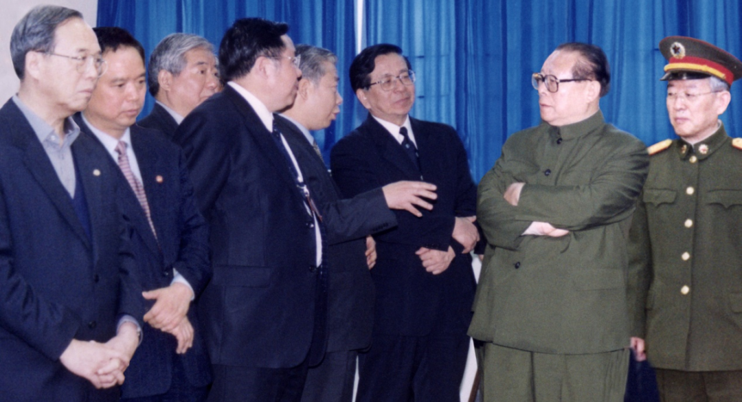 江澤民同志曾參觀系統(tǒng)工程研究院、中船電科旗下海鷹公司產(chǎn)品。圖為1995年,江澤民同志參觀海鷹公司展臺。