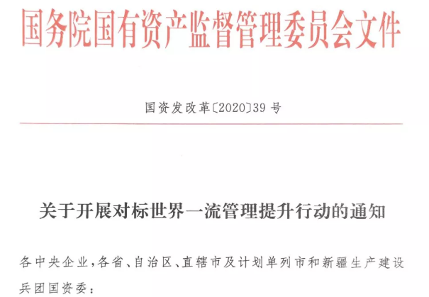 6月13日,國資委正式印發(fā)《關(guān)于開展對標(biāo)世界一流管理提升行動的通知》(以下簡稱《通知》),對國有重點企業(yè)開展對標(biāo)提升行動作出部署安排。