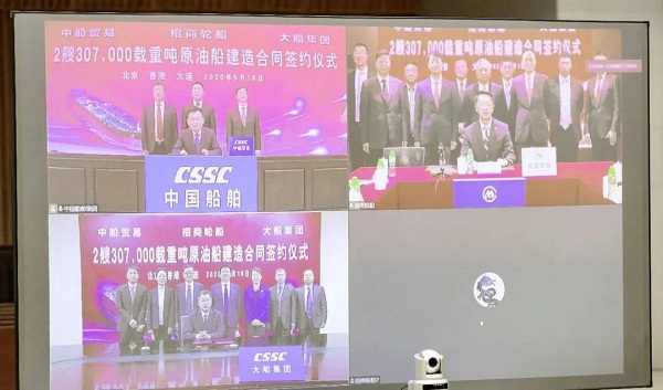 ????5月18日,中國船舶集團旗下大船集團、中船貿易與招商局集團旗下招商輪船在北京、大連、香港三地以“云簽約”方式簽署2艘30.7萬載重噸原油船建造合同。中國船舶集團副總經理孫偉、招商局集團副總經理王宏、招商輪船董事長謝春林出席簽約儀式,中船貿易董事長李洪濤、大船集團總經理楊志忠、招商輪船總經理王永新代表各方在建造合同上簽字。