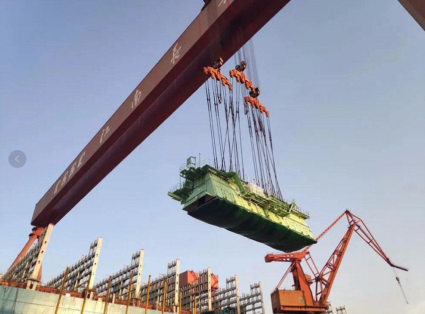 ????日前,中國船舶集團(tuán)旗下滬東中華順利完成23000TEU集裝箱船3號(hào)船的主機(jī)吊裝工作,標(biāo)志著該船向出塢邁出最關(guān)鍵一步。主機(jī)吊裝整個(gè)過程用時(shí)不到5天,同時(shí)取得僅用2.5天就完成5大件吊裝的新突破,為同行業(yè)系列船最短紀(jì)錄。
