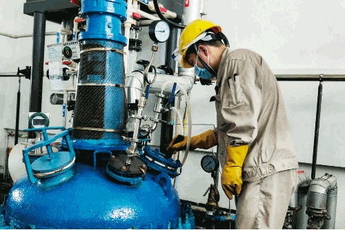 在原料藥車間,七一六所杰瑞藥業(yè)員工細心查看反應釜內(nèi)物料反應情況。此時釜內(nèi)溫度高達124.8℃,近身溫度超過50℃,全程反應時間約3~4小時。