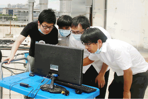 七一七所技術人員,在所內(nèi)試驗樓頂頭頂烈日開展工作。