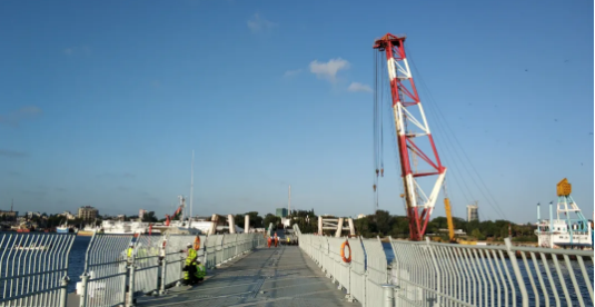 日前,中國船舶集團旗下中船應急承建的肯尼亞蒙巴薩人行浮橋正式建成通行。蒙巴薩作為肯尼亞第二大城市,是全國重要工商業(yè)中心,其港口為非洲東海岸最大海港。浮橋的建成,使蒙巴薩主島和周邊地區(qū)兩岸居民通行時間由原來的45分鐘縮短至10分鐘,極大方便了當?shù)鼐用癯鲂小M瑫r,浮橋通航孔的設計可滿足萬噸大型船舶暢通進出蒙巴薩港口。
