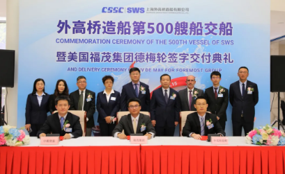 4月15日,由中國船舶集團旗下外高橋造船自主開發、設計和建造的21萬噸紐卡斯爾型散貨船“德梅”號交付美國福茂集團。這是外高橋造船自2003年交付第一艘商品船以來,精心出品的第500艘船,完工總量累計8968萬載重噸,年均27.8艘/498.2萬載重噸,位居中國第一,躋身全球前列。