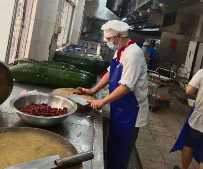 而在技校和養老院的后廚,阮積劍等廚師們同樣已經整裝待發。在社區封閉初期,飲食服務部養老院飯堂員工由原來的18人劇減至7人。廚師梁志寬面對每日約800人的進餐人數,迎難而上,轉變菜式花樣,合理優化膳食,注重營養搭配,以嫻熟的廚藝獨自完成后廚大量工作,保證了菜肴準時出品。而廚師、黨員陳兆銘得知飯堂因受疫情影響而人手嚴重不足,在試航歸來做完核酸檢測后立即回到養老院飯堂的崗位上。為此,他直接把“家”安在了養老院,每天睡在簡易折疊床上。