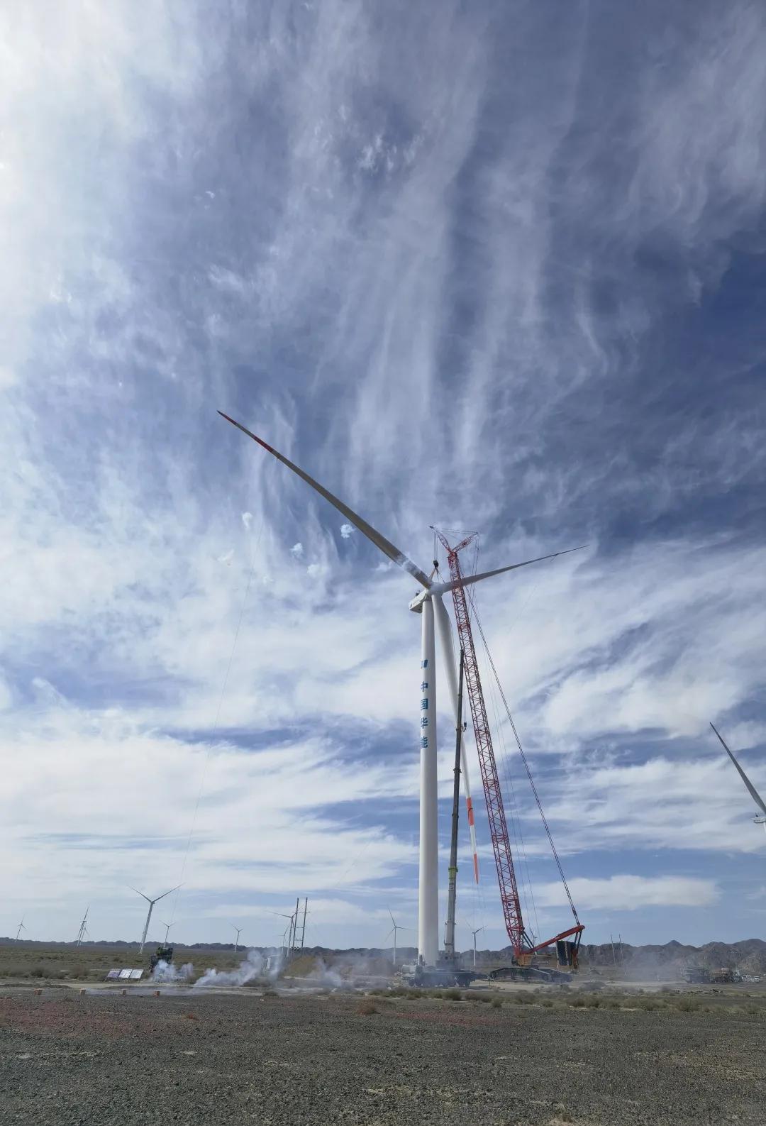 該項(xiàng)目于4月12日啟動(dòng)首臺(tái)機(jī)組吊裝,中國海裝項(xiàng)目人員提前制訂吊裝調(diào)試方案及安全預(yù)案,采取“邊吊裝邊調(diào)試”的方式加快整體工程進(jìn)度,克服戈壁灘高溫天氣和疫情反復(fù)等困難,于7月10日實(shí)現(xiàn)首批100MW實(shí)現(xiàn)全容量并網(wǎng),8月20日實(shí)現(xiàn)59臺(tái)機(jī)組全部吊裝。