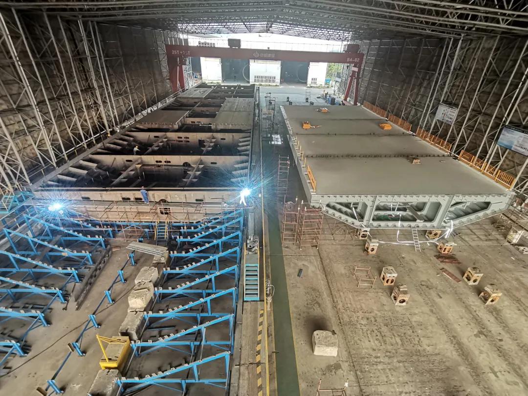 同樣承擔了深中通道隧道沉管鋼殼制造任務的中國船舶集團旗下廣船國際,近日剛剛完成了E15管節鋼殼的過駁交付。E16鋼殼計劃在9月底前進行聯合驗收;E17鋼殼則正在進行大節段總組。