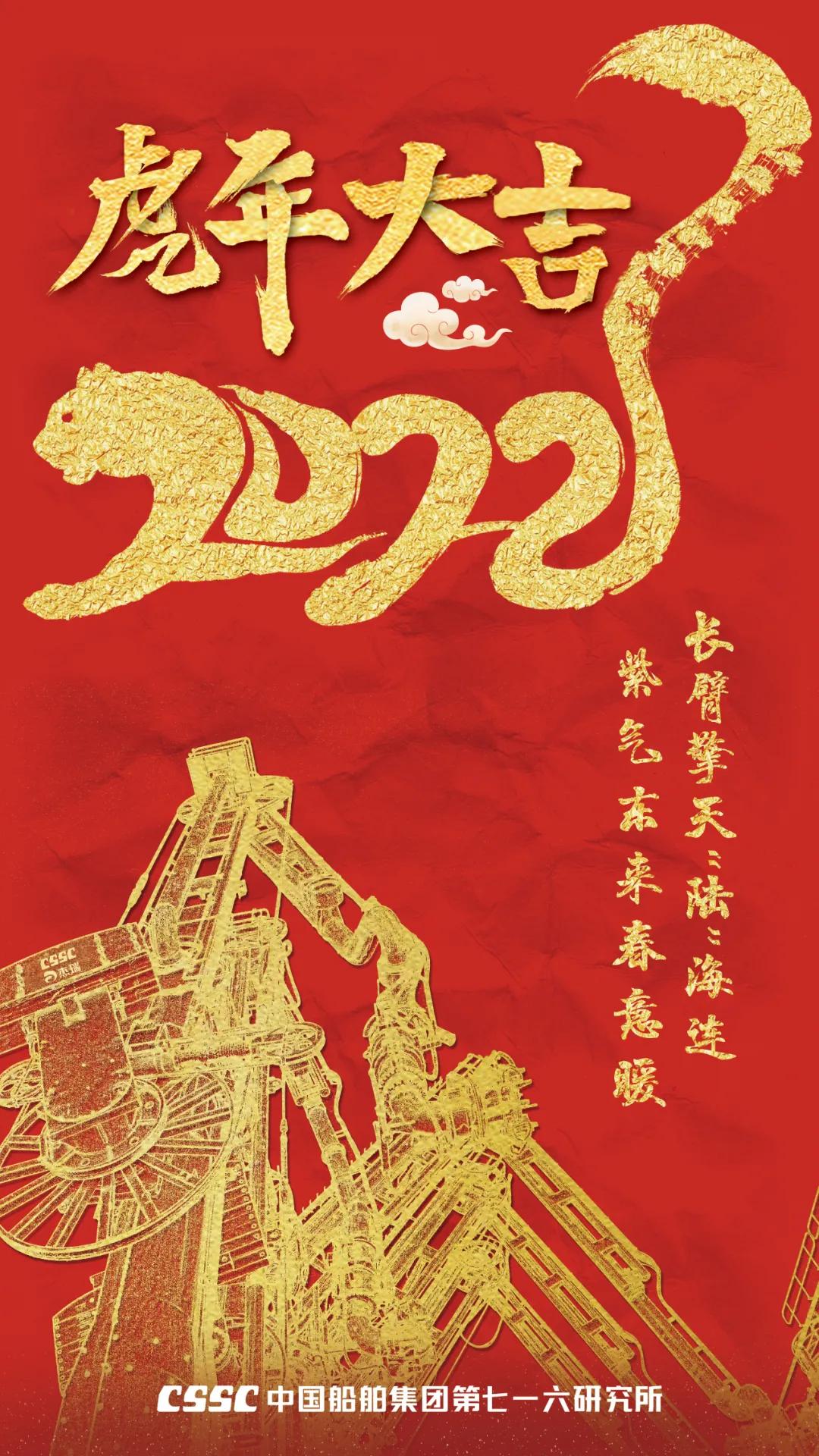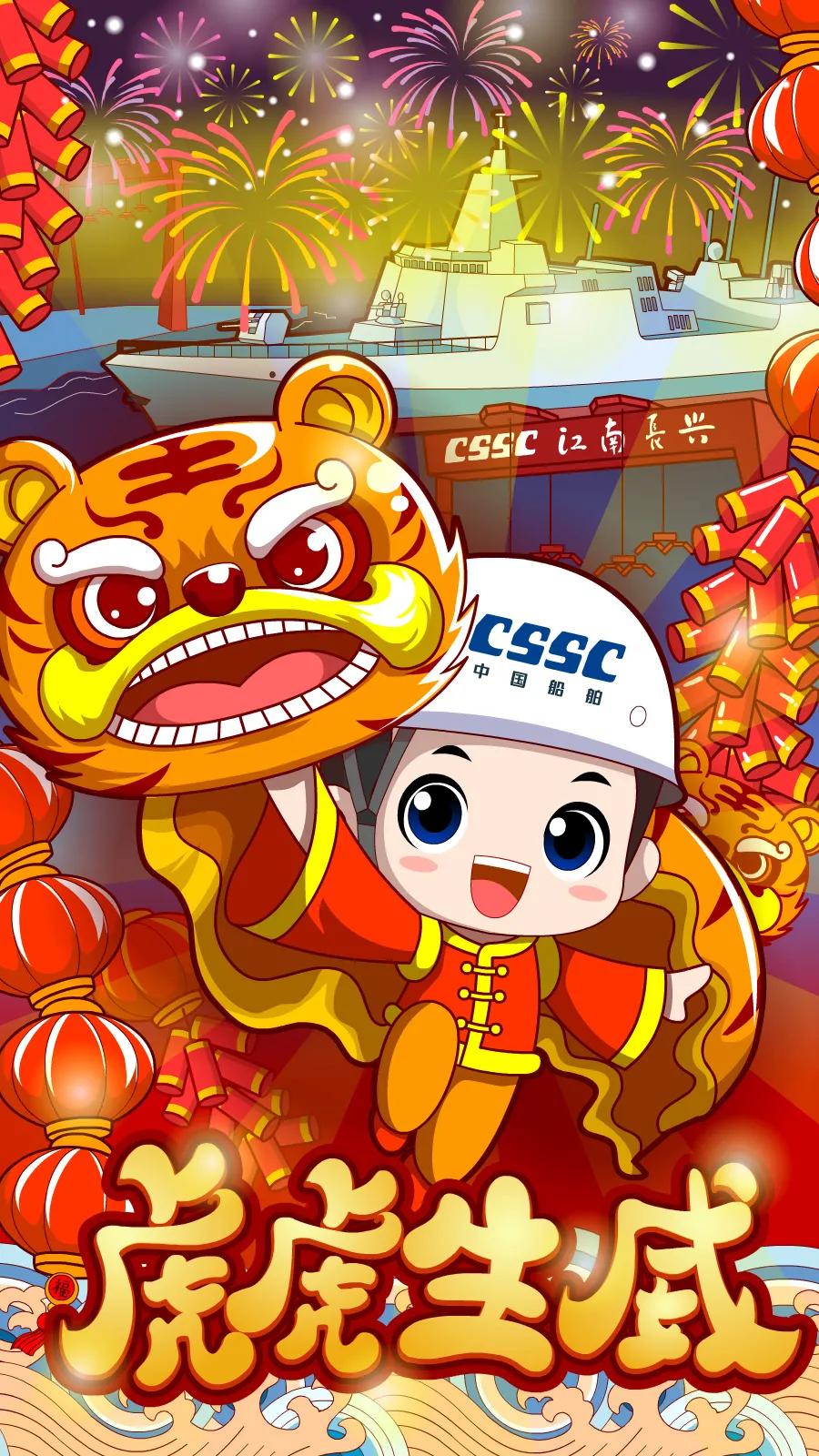 海報采用國潮畫風(fēng),中間部分“江小南”穿著新衣舉著虎頭,寓意新的一年中國船舶人虎虎生威,上面部分以重要產(chǎn)品和廠區(qū)設(shè)備為主,詮釋江南造船建造國之重器的初心和使命,同時輔以鞭炮、煙花、燈籠等新年元素,使海報充滿喜慶祥和的新年氛圍。