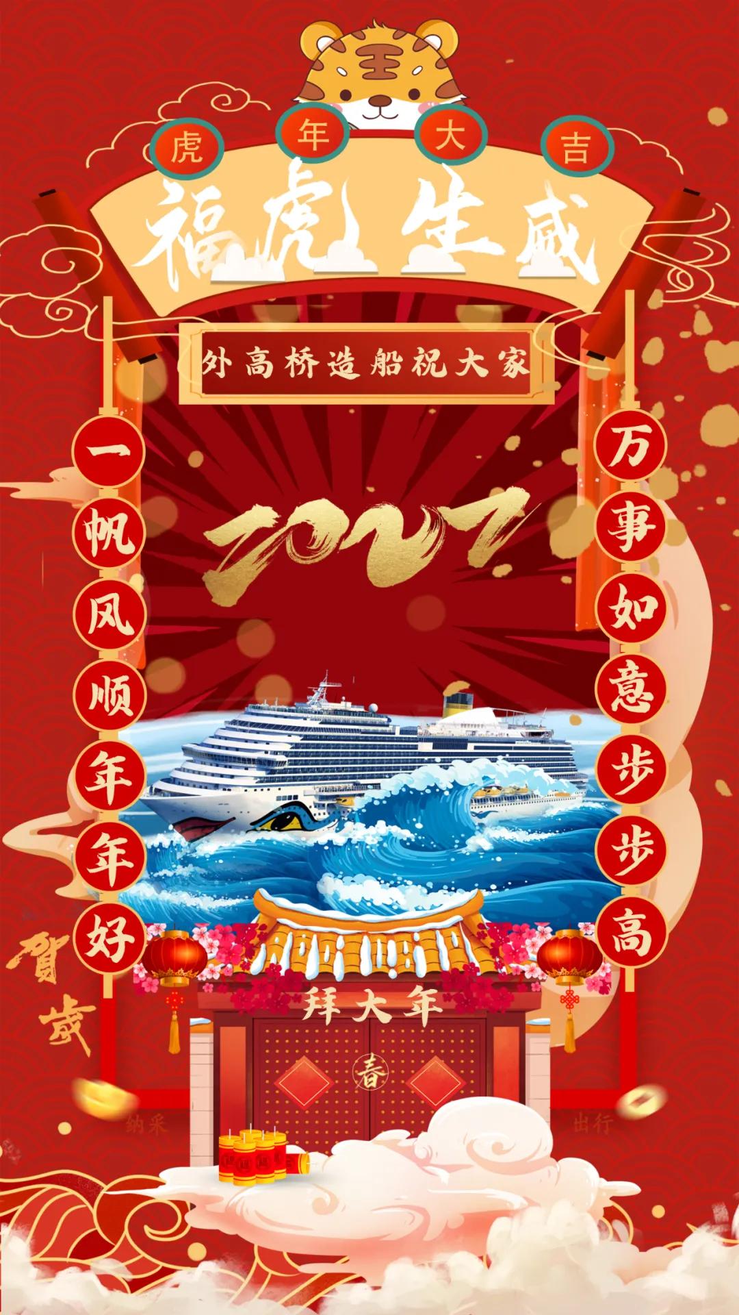 以門為前景,郵輪在海上乘風(fēng)破浪,寓意中國首制大型郵輪建造能取得開門紅!以紅色為背景,表達(dá)新年喜慶的節(jié)日氛圍,也祝福祖國郵輪產(chǎn)業(yè)的發(fā)展紅紅火火,蒸蒸日上!