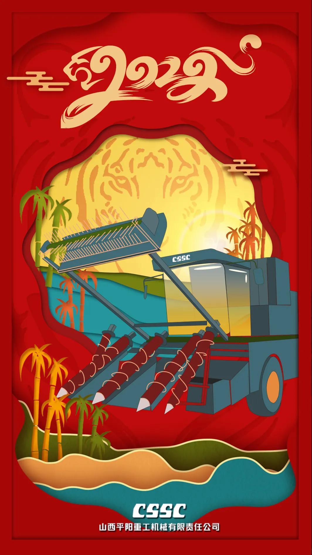 海報采用剪紙風(fēng)格,層層遞進(jìn)的縱深感傳遞著平陽人不斷探索創(chuàng)新的拼搏精神;海報主體為平陽重工新產(chǎn)品——甘蔗收獲機(jī),展示著平陽風(fēng)采;海報以“虎紋”為背景,以紅色為主色調(diào),烘托出虎年的喜慶氛圍。
