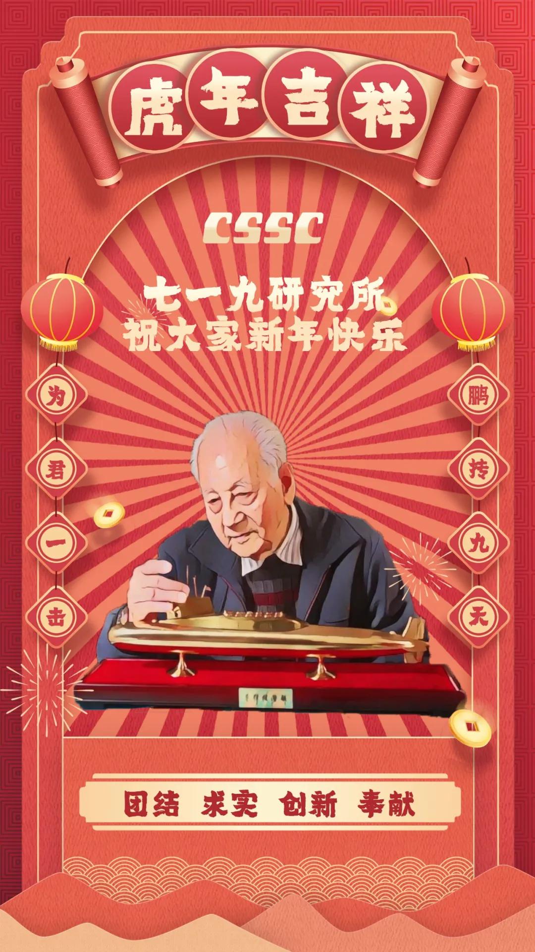 節(jié)日的煙花詮釋喜慶,大紅的燈籠點亮祝福!黃旭華院士作為七一九所典型人物代表,認(rèn)真注視著他為之奉獻(xiàn)一生的艇,也反映了這條戰(zhàn)線上科技工作者們“團(tuán)結(jié)、求實、創(chuàng)新、奉獻(xiàn)”的工作作風(fēng)。“為君一擊 鵬摶九天”暗藏“一九”二字,反映出七一九所肩負(fù)的責(zé)任之大,使命之重,表達(dá)了軍工人將船舶事業(yè)做大做強(qiáng)的決心。