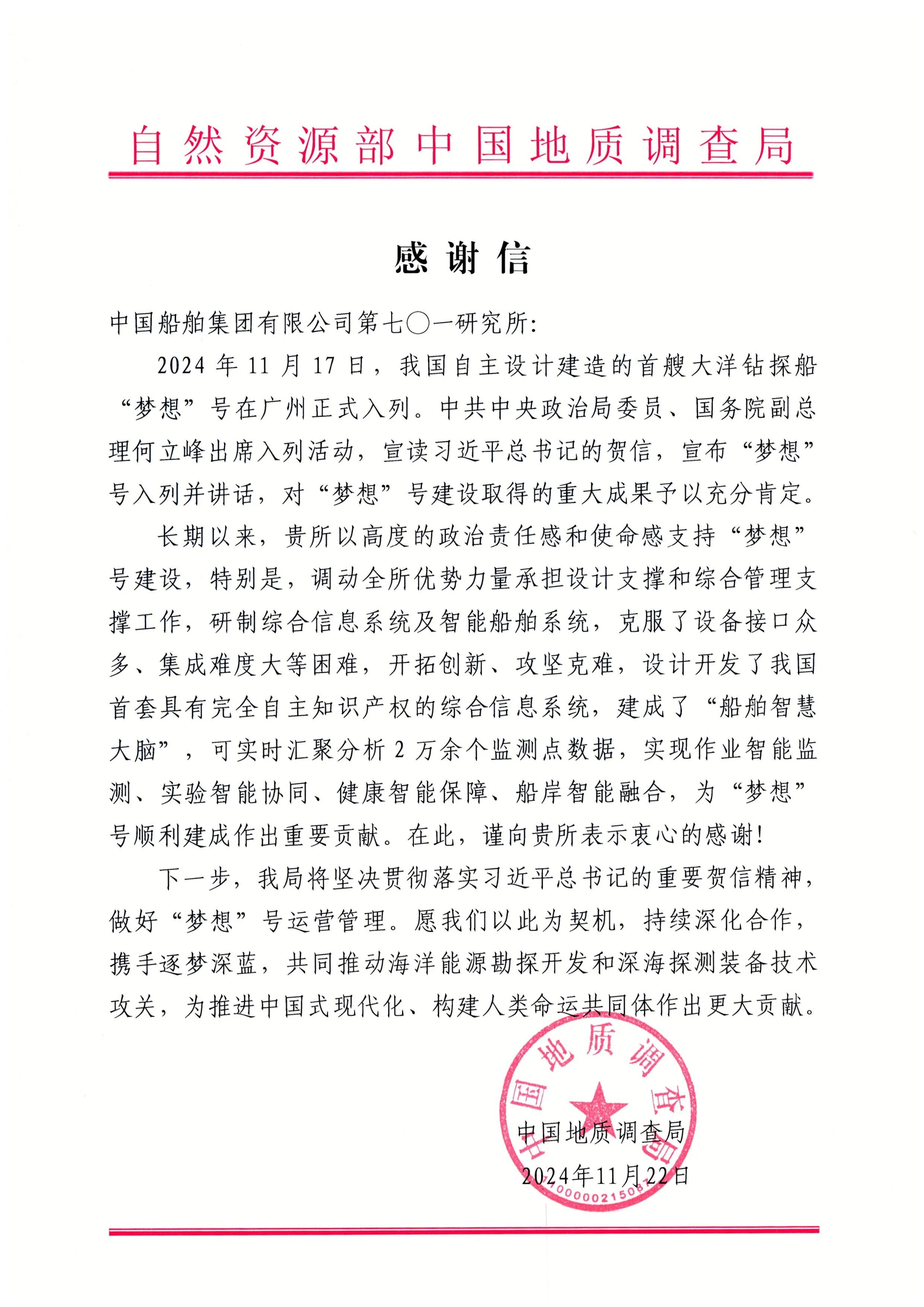 中國地質(zhì)調(diào)查局在信中對中國船舶集團(tuán)七〇一所在“夢想”號設(shè)計(jì)支撐和綜合管理支撐、綜合信息系統(tǒng)及智能船舶系統(tǒng)研制等方面所做的重要貢獻(xiàn)表示感謝。