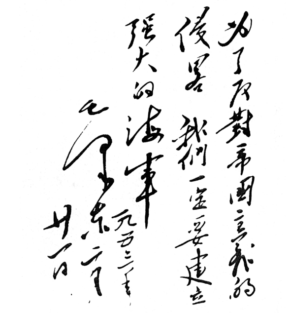 1953年2月19日,毛澤東在武漢登上長(zhǎng)江艦視察長(zhǎng)江中下游四省,并在長(zhǎng)江艦上為海軍題詞:“為了反對(duì)帝國(guó)主義的侵略,我們一定要建立強(qiáng)大的海軍。”船未行至南京,毛澤東提出要在南京檢閱海軍戰(zhàn)艦。華東海軍立即抽調(diào)了“廣州”號(hào)和“南昌”號(hào)護(hù)衛(wèi)艦、“黃河”號(hào)登陸艦,以及101號(hào)、104號(hào)魚雷艇參加檢閱。幾天中,毛澤東連續(xù)5次都寫下同樣的題詞:“為了反對(duì)帝國(guó)主義的侵略,我們一定要建立強(qiáng)大的海軍”。這是中國(guó)領(lǐng)導(dǎo)人對(duì)建設(shè)強(qiáng)大海軍、建設(shè)一流裝備的殷切期望,是新生的中國(guó)對(duì)建設(shè)強(qiáng)大海防的決心。如今這顆刻著偉人囑托的銘石,靜靜矗立在江南造船長(zhǎng)興島造船基地行政樓前的草坪,也靜靜地矗立在每一位江南人的心中。