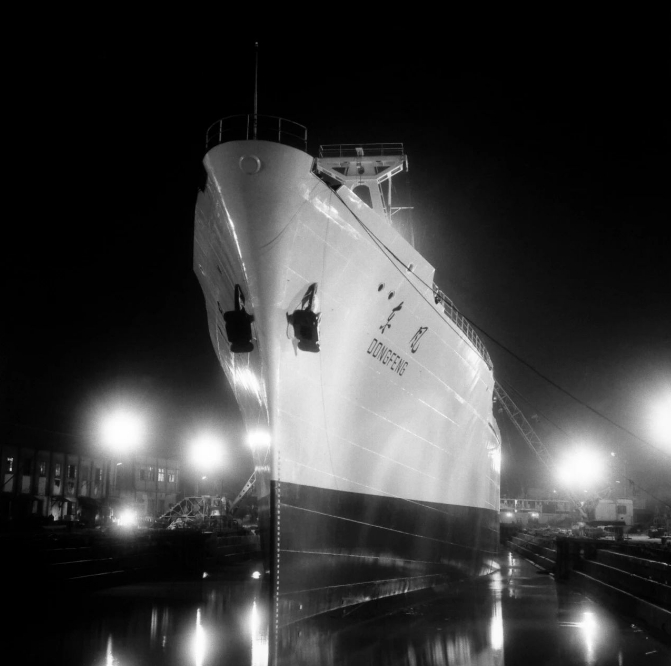 “一五”后期,研制萬噸級(jí)遠(yuǎn)洋貨船被列為國(guó)家新科技規(guī)劃的重點(diǎn)項(xiàng)目。在西方長(zhǎng)期封鎖尤其是后來蘇聯(lián)中止援助的困難局勢(shì)下,“東風(fēng)”號(hào)是中國(guó)人首次嘗試自行設(shè)計(jì)、自行建造,全部采用國(guó)產(chǎn)設(shè)備的首艘萬噸遠(yuǎn)洋船。1960年4月15日,“東風(fēng)”號(hào)下水,時(shí)任上海市委書記陳丕顯、副市長(zhǎng)曹荻秋等人出席下水典禮。萬噸輪被命名為“東風(fēng)”號(hào)。