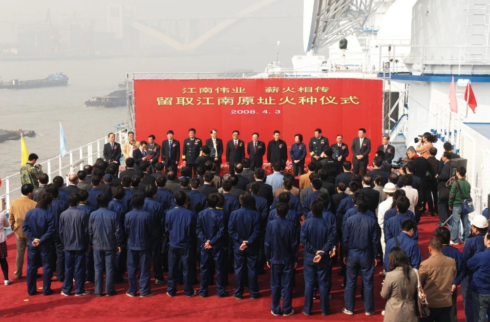 2008年4月,江南造船老廠建造的最后一艘船“遠(yuǎn)望6”號(hào)航天測(cè)量船即將交付。4月3日,時(shí)任江南造船搭載部部長(zhǎng)黃文飛作為取火者從“遠(yuǎn)望6”號(hào)船前甲板的上建位置手拿焊槍取火引燃火炬。火炬依次傳遞至勞動(dòng)模范、三八紅旗手、江南造船領(lǐng)導(dǎo)等,最后傳至?xí)r任中船集團(tuán)總經(jīng)理陳小津手中并由他點(diǎn)燃了火種盒。6月3日,江南造船人親手建造的船舶特地趕回“娘家”,載著江南“火種”駛往新基地,為新建造的產(chǎn)品開工點(diǎn)火。