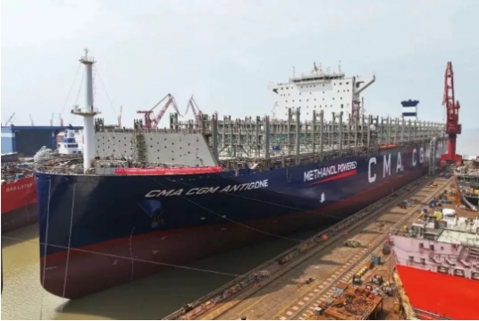 出塢的16000TEU甲醇雙燃料動力大型集裝箱船首制船是江南造船自主研發設計的“鯤系列”船舶,也是首艘實現了全船模擬堆箱綁扎試驗的超大型雙燃料集裝箱船。該船出塢前達到機艙發電機動車狀態和全船亮燈。