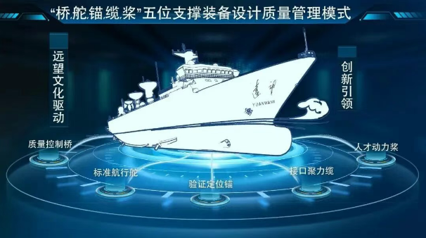 基于“全自主研發”和“巨系統抓總”的問題導向,七〇八所“遠望”研發創新團隊凝聚智慧和力量,以創新為引領、以遠望文化為驅動,提煉了“橋、舵、錨、纜、槳”五位支撐裝備設計質量管理模式。各項核心管理要素相互作用、五位支撐裝備研發設計過程,構建形成了一個良好向上、持續提升的團隊質量管理機制,為確保裝備研制質量奠定了堅實基礎?!皹颉笔恰芭灅颉钡暮喎Q,是艦船駕駛控制、觀察及決策的主要設施,其作用如同質量控制?!岸妗笔强刂婆灤叫蟹较虻闹饕O備,其作用如同規范指引?!板^”作為艦船停泊和定位的主要設備,其作用如同試驗驗證?!袄|”作為艦船靠幫連接的主要設備,其作用如同接口管理?!皹笔翘峁┡灤叫袆恿Φ闹饕O備,其作用如同人才保障。