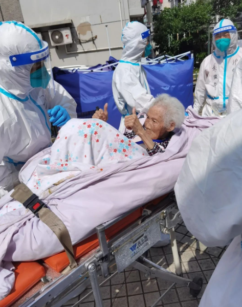 “我們是穿著防護(hù)服進(jìn)去的,突然看到這么多‘大白’,老人們不免有些緊張,問(wèn)的最多的就是‘去哪里’。隨著我們一趟趟幫著老人下樓、上車,老人們開始逐漸信任我們。因?yàn)檗D(zhuǎn)運(yùn)的部分老人中存在核酸異常的情況,有些老人還會(huì)時(shí)不時(shí)關(guān)照我們要注意防護(hù)。幫他們送上救護(hù)車時(shí),老人還和我們連聲表示感謝?!碧镅┟髡f(shuō)道。