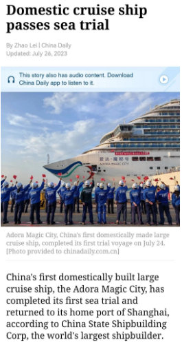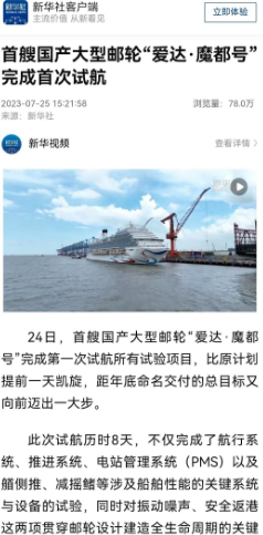 7月24日晚,首艘國產大型郵輪“愛達·魔都號”完成第一次試航所有試驗項目比原計劃提前一天凱旋,人民日報、新華社、中央電視臺等中央主流媒體進行了報道。