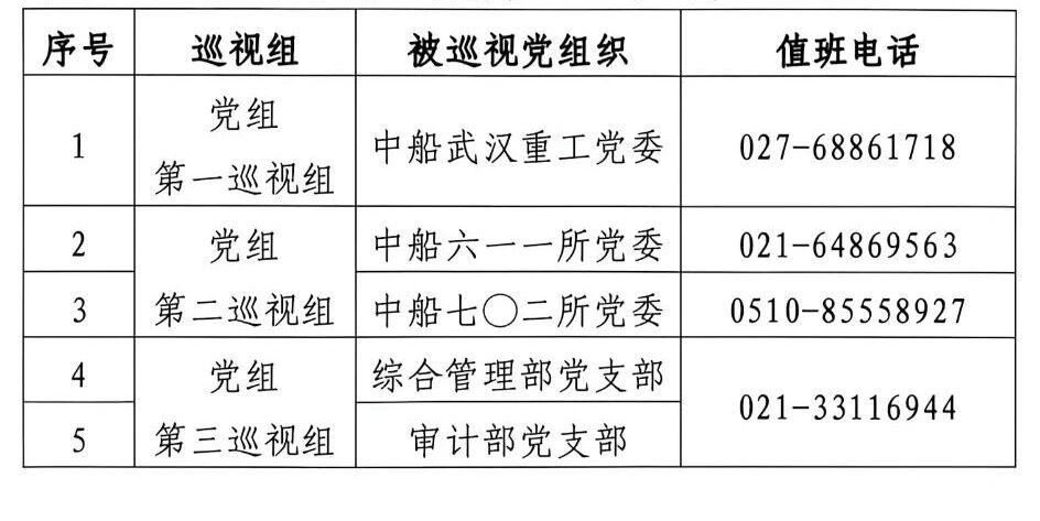 按照中國船舶集團(tuán)有限公司黨組對巡視工作統(tǒng)一部署,近日,2026年度第一批次巡視組完成全面進(jìn)駐。此批巡視分3個巡視組,分別對中船武漢重工黨委、中船六一一所黨委、中船七〇二所黨委等黨組織開展常規(guī)巡視,對總部綜合管理部黨支部、審計(jì)部黨支部開展“四型”總部建設(shè)專項(xiàng)巡視。