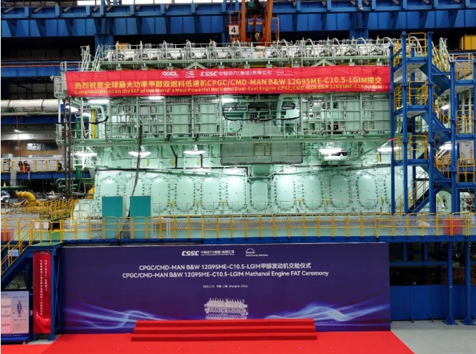 5月15日,中船集團(tuán)旗下中船動力與MAN ES聯(lián)合舉辦的CPGC/CMD-MAN B&W 12G95ME-C10.5-LGIM-EGRTC甲醇發(fā)動機(jī)工廠驗收測試(FAT)交驗儀式在中船動力下屬中船三井成功舉行。